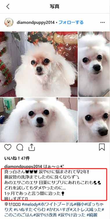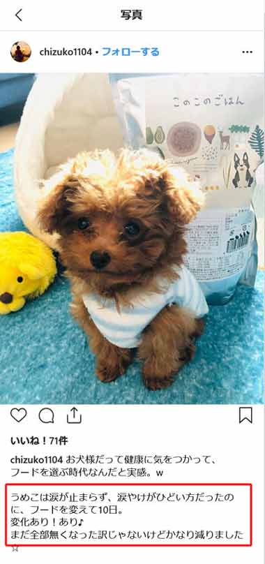 | このこのごはんサンプルお試し成功事例5 涙やけに悩んでいるトイプードルちゃん。 今日からこのこのごはんのお試しに挑戦すると宣言! まずは「食いつき」が最高だそうです。 こちらのプードルちゃんも、涙やけが治るまで時間の問題でしょう。 |