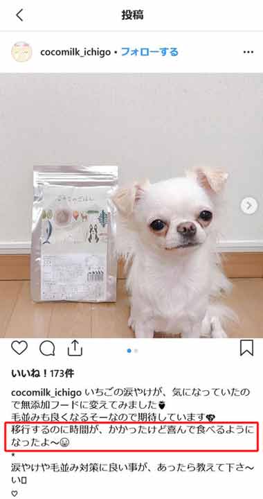 | このこのごはんサンプルお試し成功事例2 涙やけと毛並みの改善でこのこのごはんお試しを開始したチワワちゃん。 文面から、最初の移行に食べないなど苦労があったようですが、時間を掛けて食べるようになったようです。 涙やけと毛並みの改善はこれからですね。 |