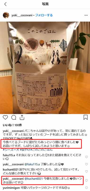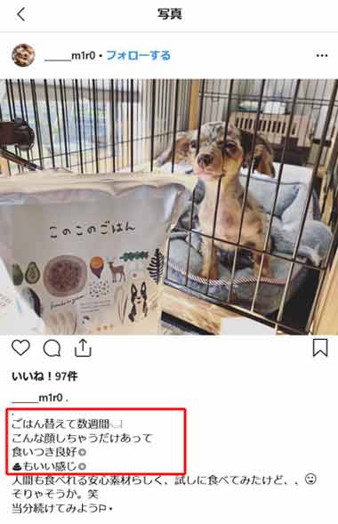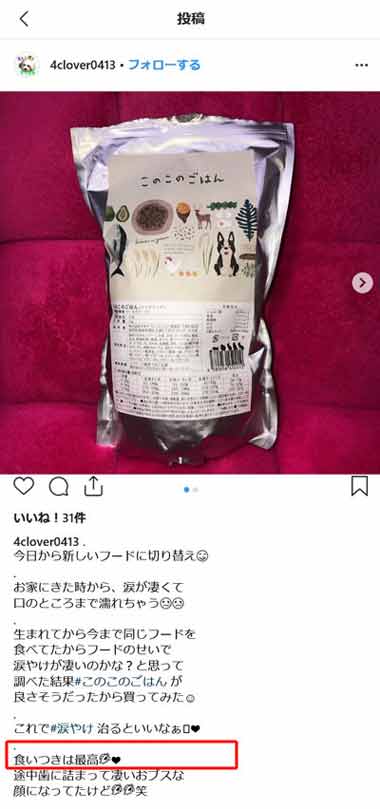 | このこのごはんサンプルお試し成功事例5 涙やけが気になっていたシーズーちゃん。 今食べてるフードに混ぜたら、あっという間に食べてしまったようです。 「食いつき」上々で、お試しの開始としてはまずまずのようです。 涙やけ完治の投稿が多いので、このシーズーちゃんもいずれ治ると思います。 |